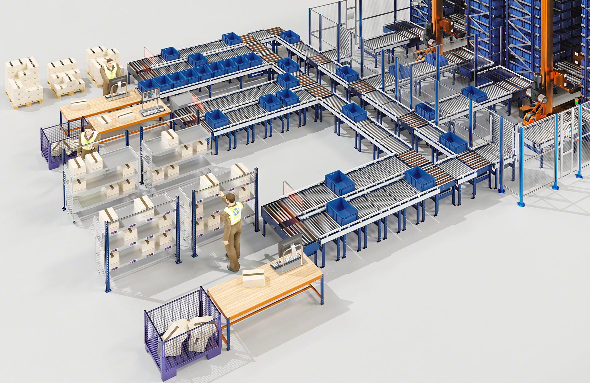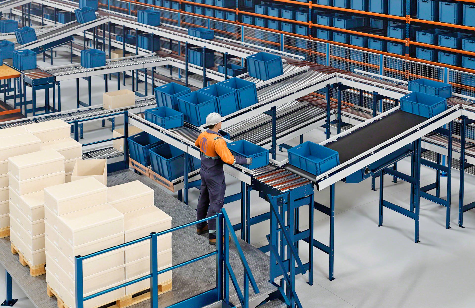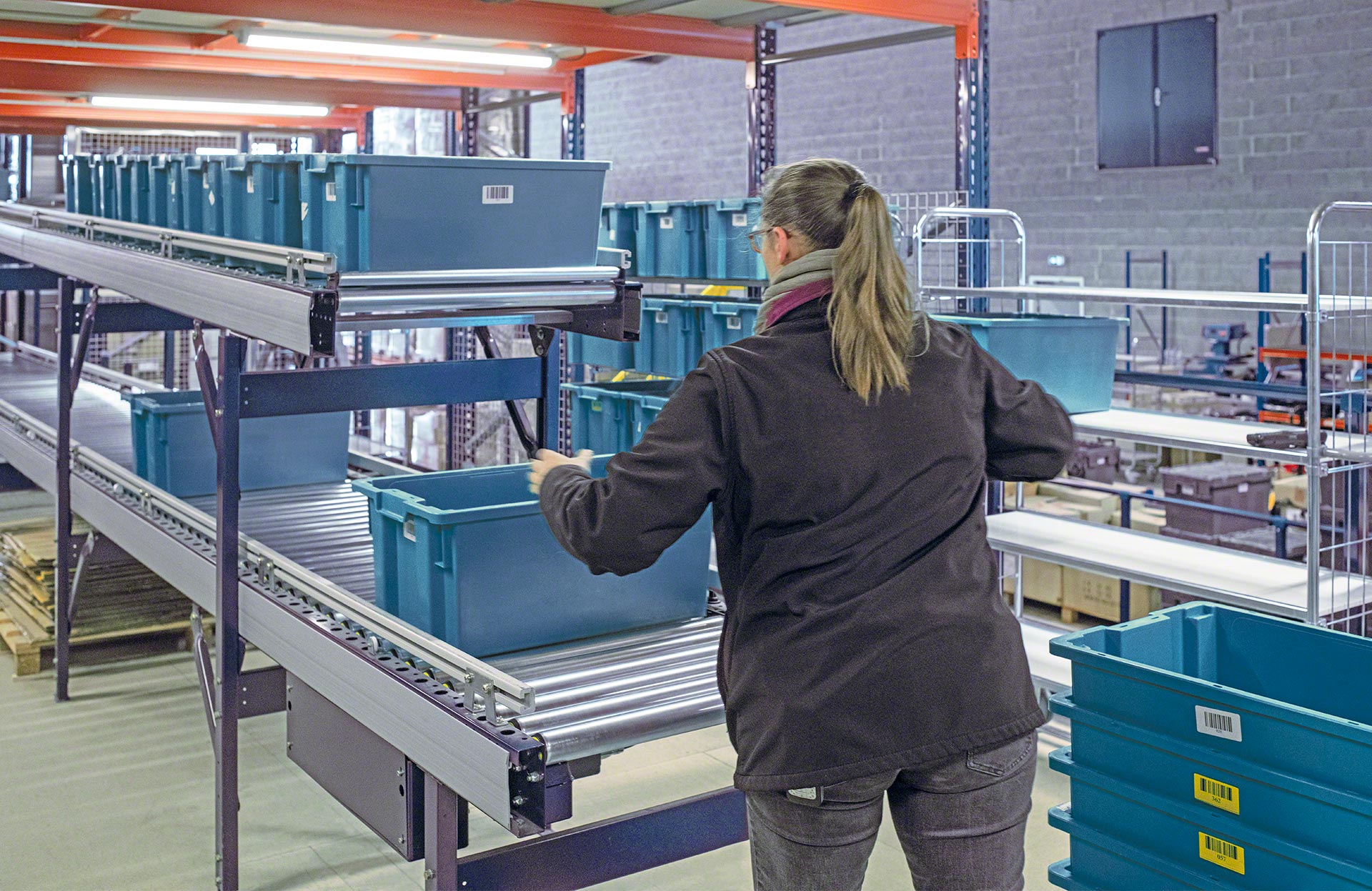 - Ergonoomiline töö: töötajad täidavad oma ülesandeid, näiteks komplekteerivad tellimusi, tänu kastide käitlemise süsteemidele mugavamalt.