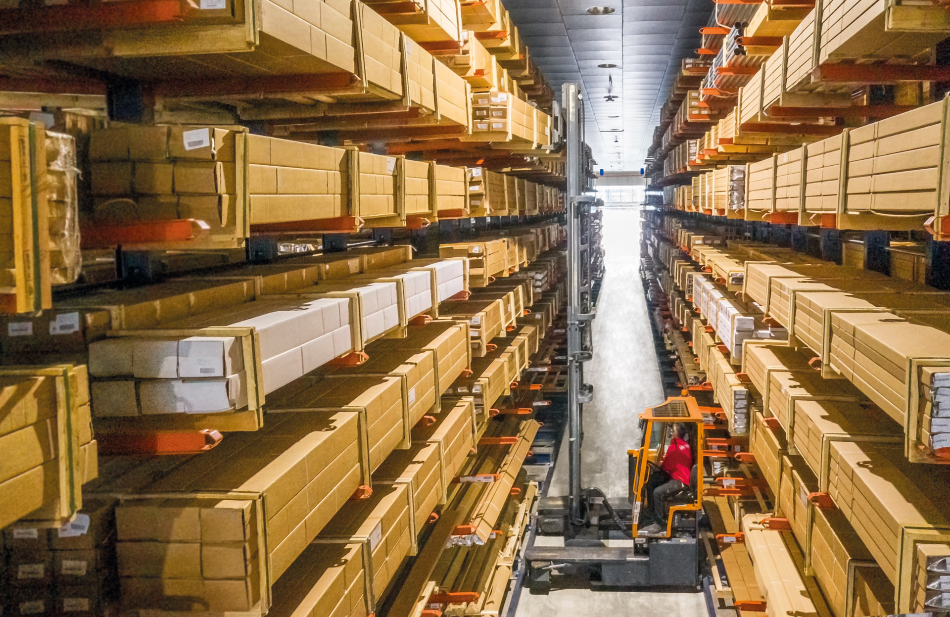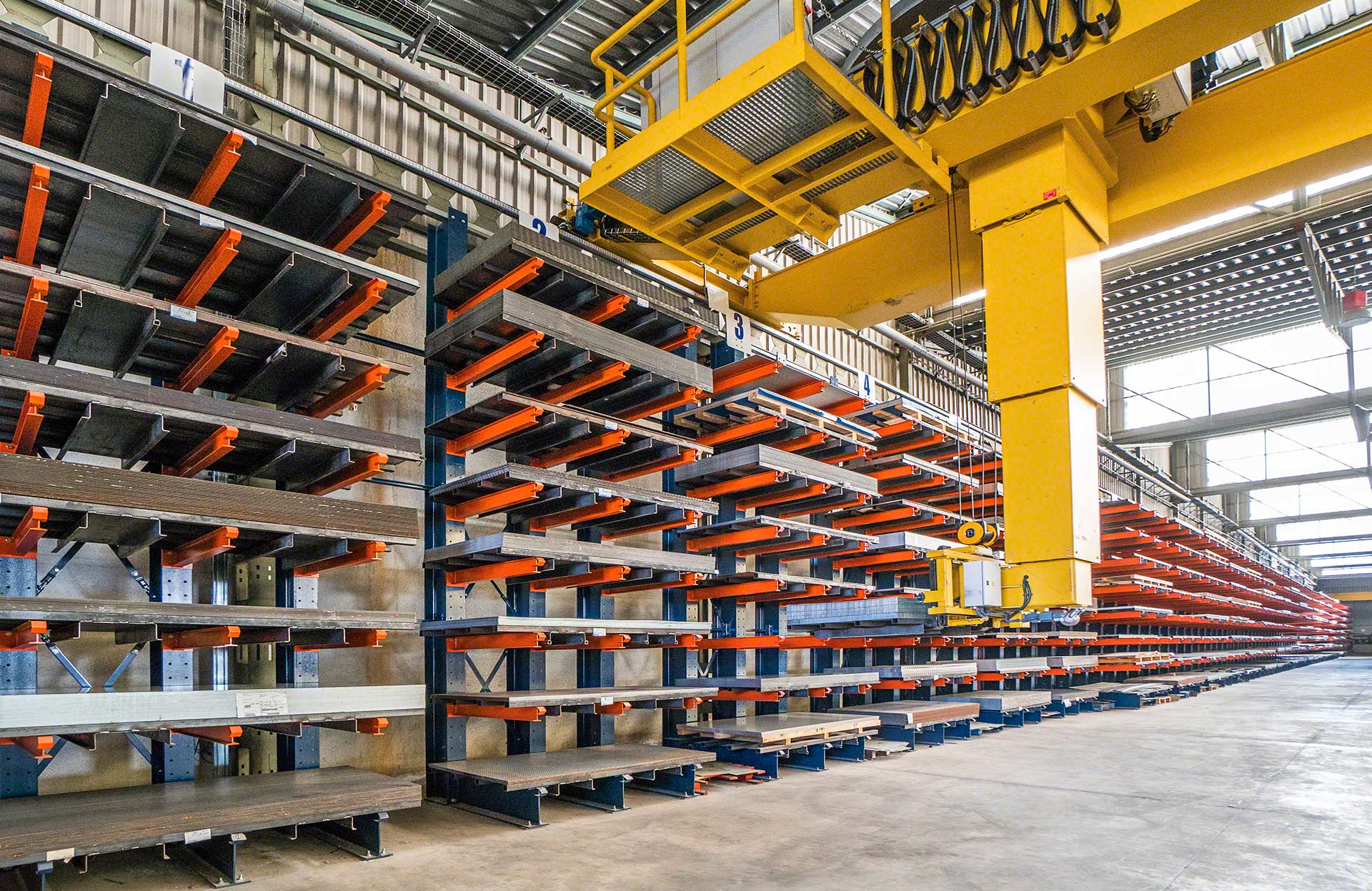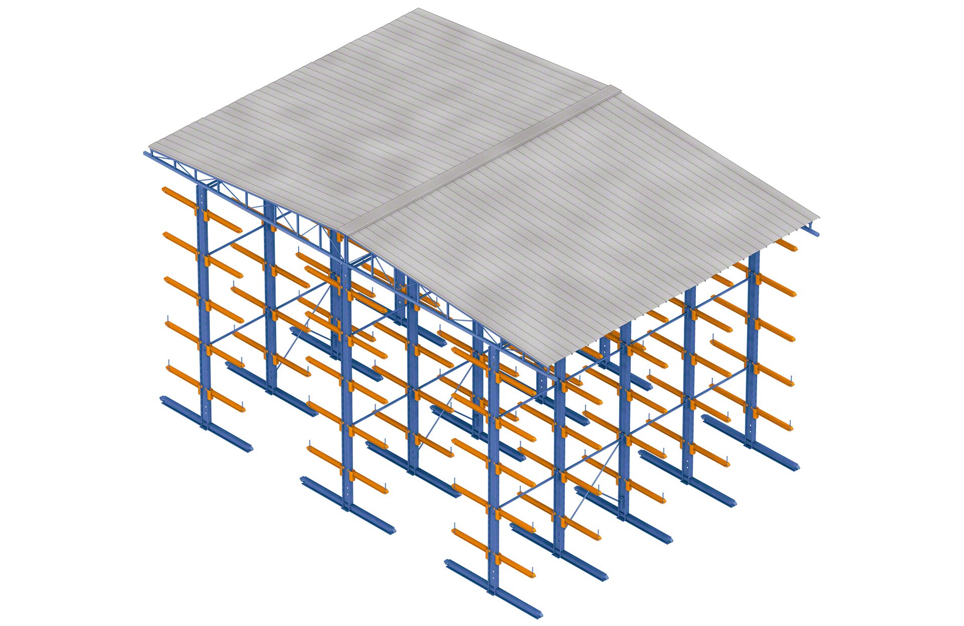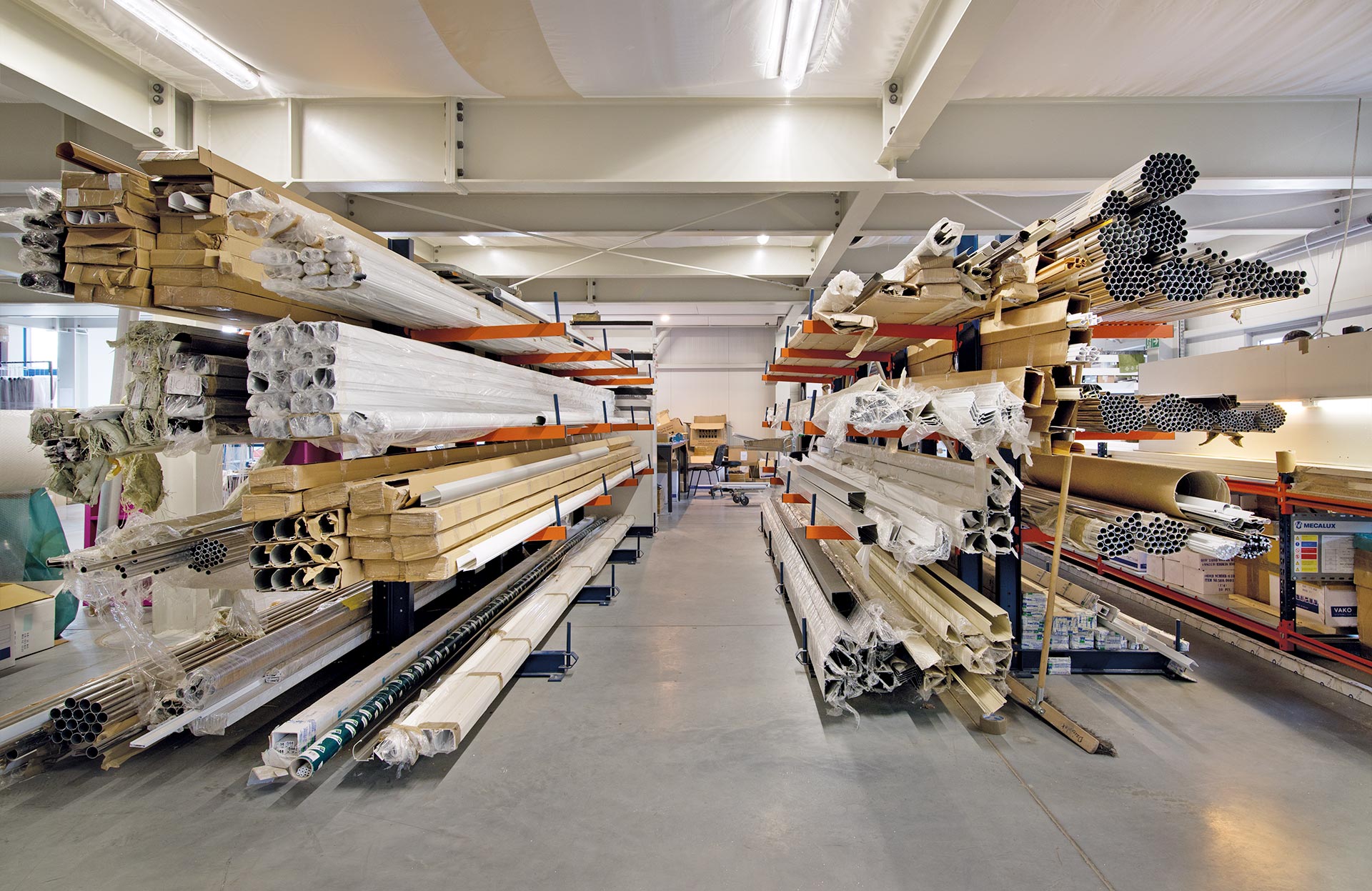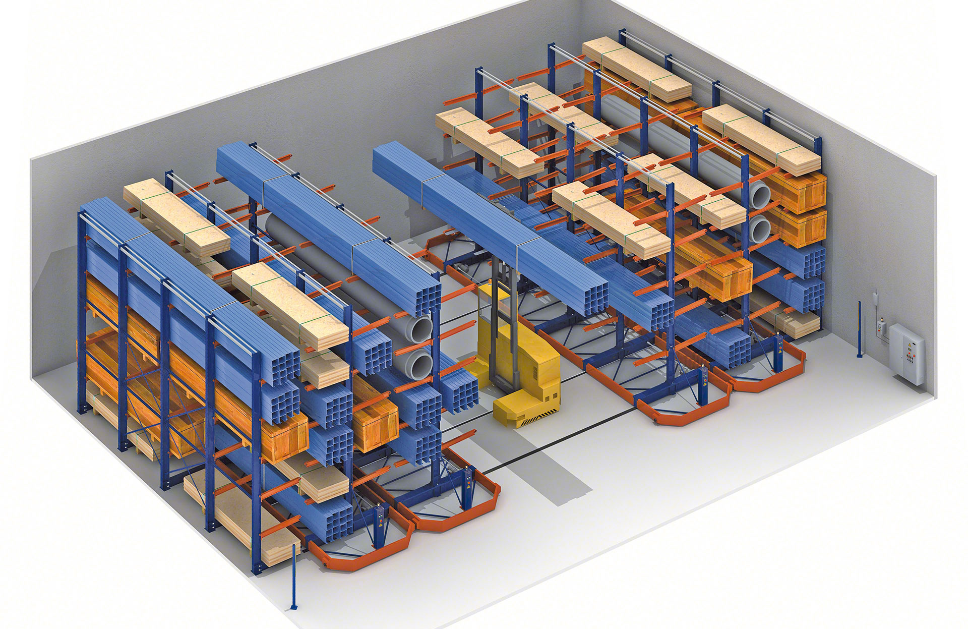 Pikkade ja mahukate esemete, näiteks torude, profiilide, laudade, metallplaatide ja liistude ladustamise süsteem.