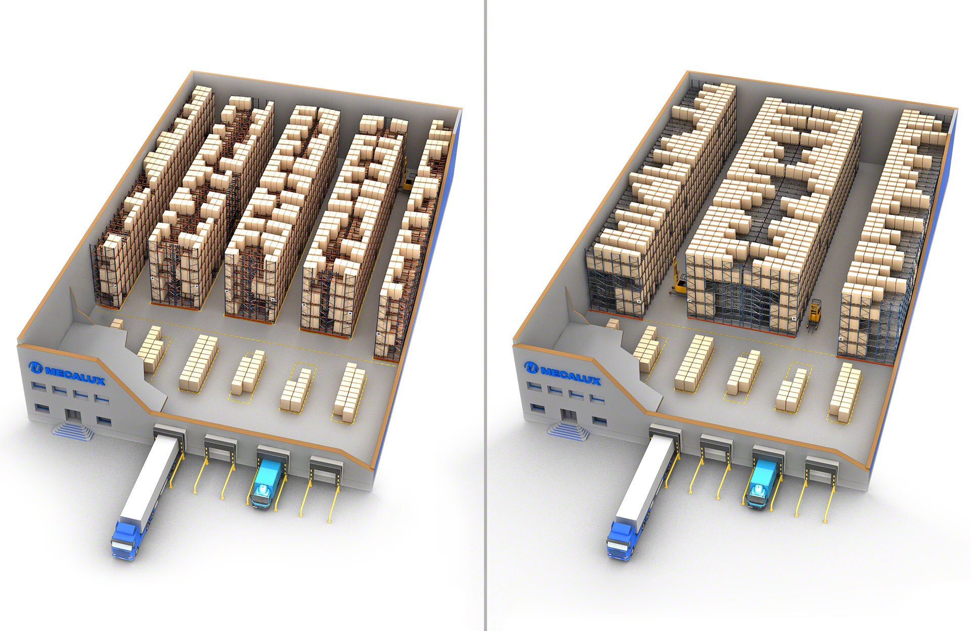 Mecaluxi kärudega tagasilükkega laoriiulid suudavad sügavuti mahutada 2 kuni 4 kaubaalust, samas kui rullikutega versioon mahutab üle nelja kaubaaluse.